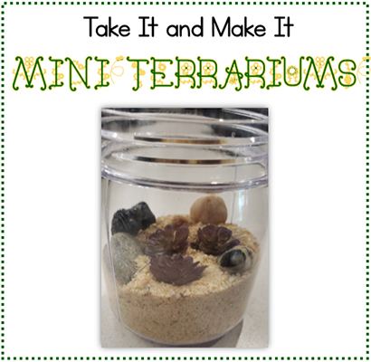 Tweens and Teens (ages 9-18), assemble a terrarium garden using our free "take-and-make kit" from the library.